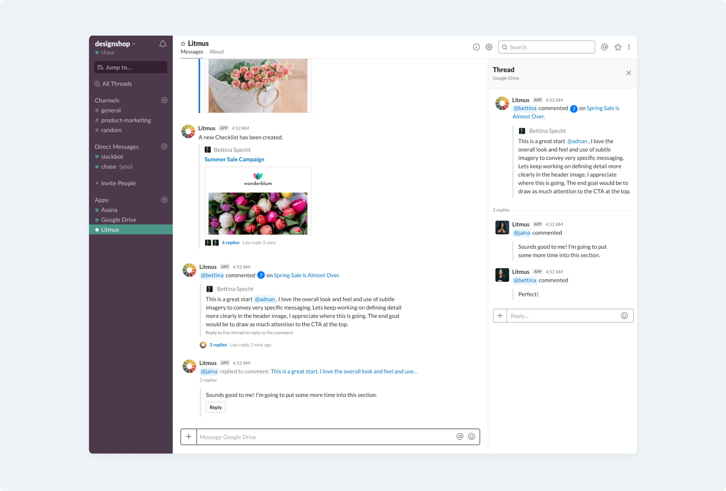 Taking advantage of Slack Threads to design ways of collaborating with users within the Litmus app without having to leave a context. Users may quickly respond within Slack and have their responses fed back into Litmus. This helps reviewers context switch less, and allows email developers to receive feedback much faster.