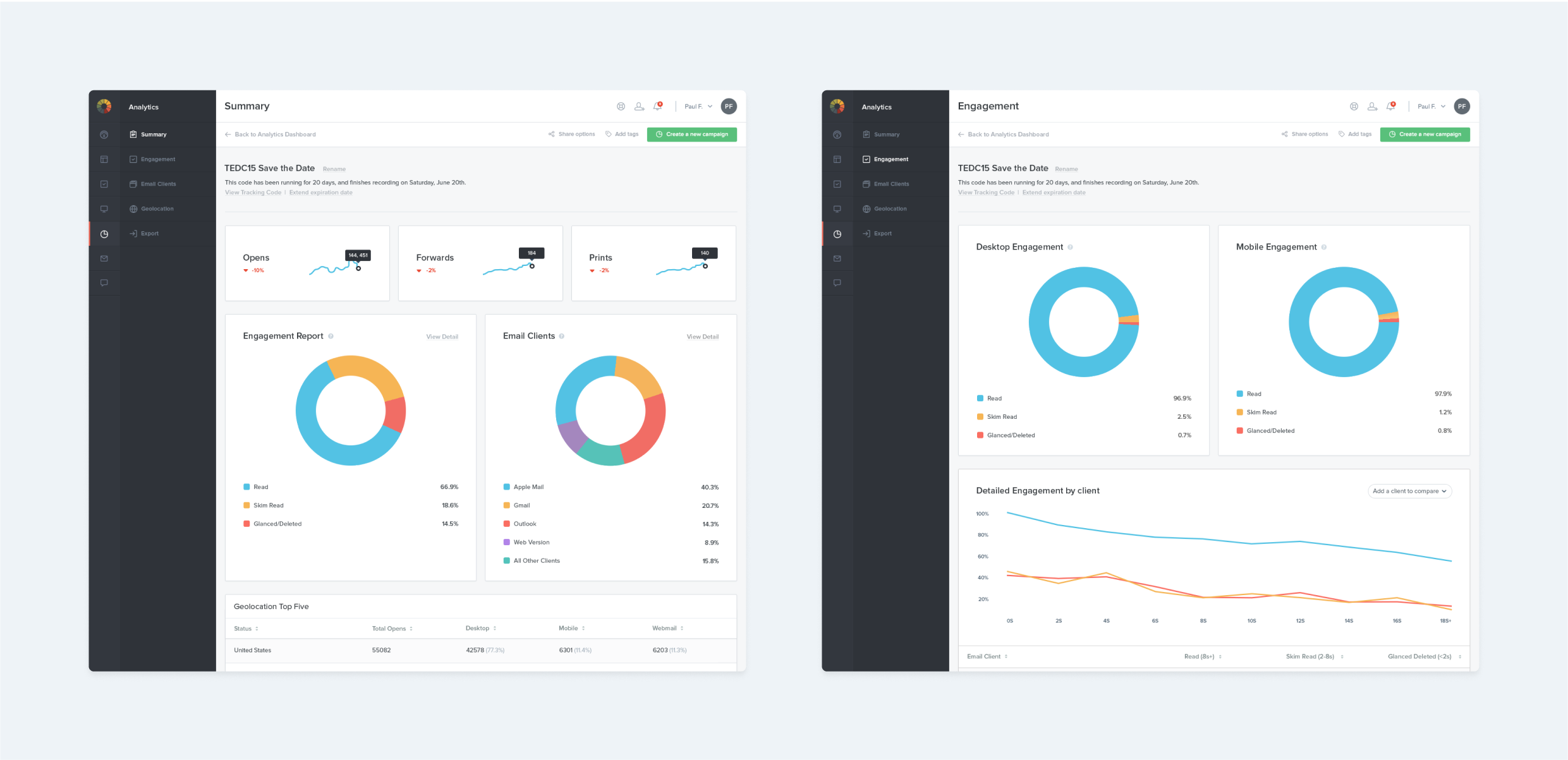 The last piece of the puzzle was to bring the existing Litmus Analytics experience up-to-date with the updated user interface. Litmus Analytics or better known in the industry as “pixel tracking” measures critical data relevant to an email send, such as opens and engagement. This lead to the design of a charts library that could be cohesively used across the application.