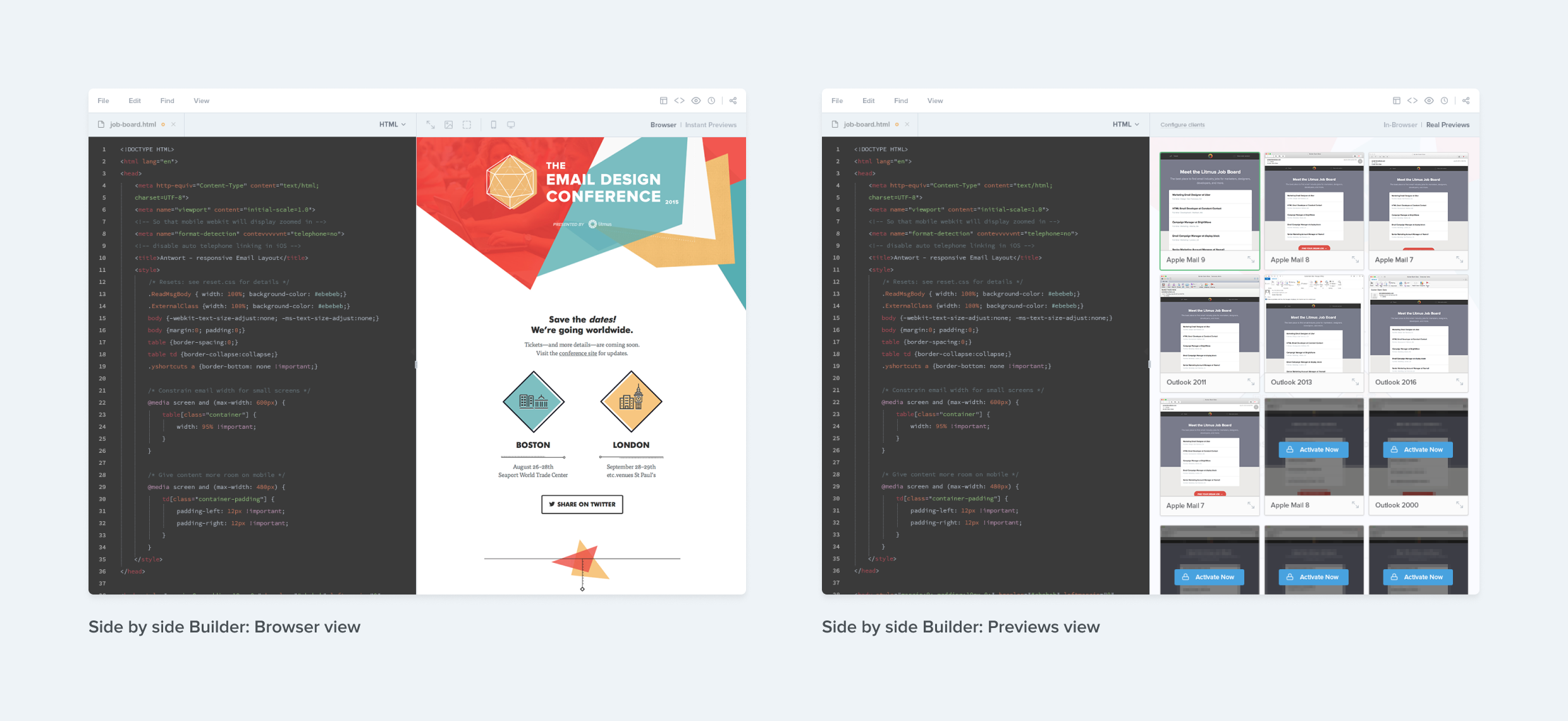 As a result of the faster previews architecture, we were able to integrate email previews directly in to the email building experience. This allowed users to switch between a browser view and a previews view. Users could even drill into a specific email client (e.g. Apple Mail 12), and test their live code within just that client.