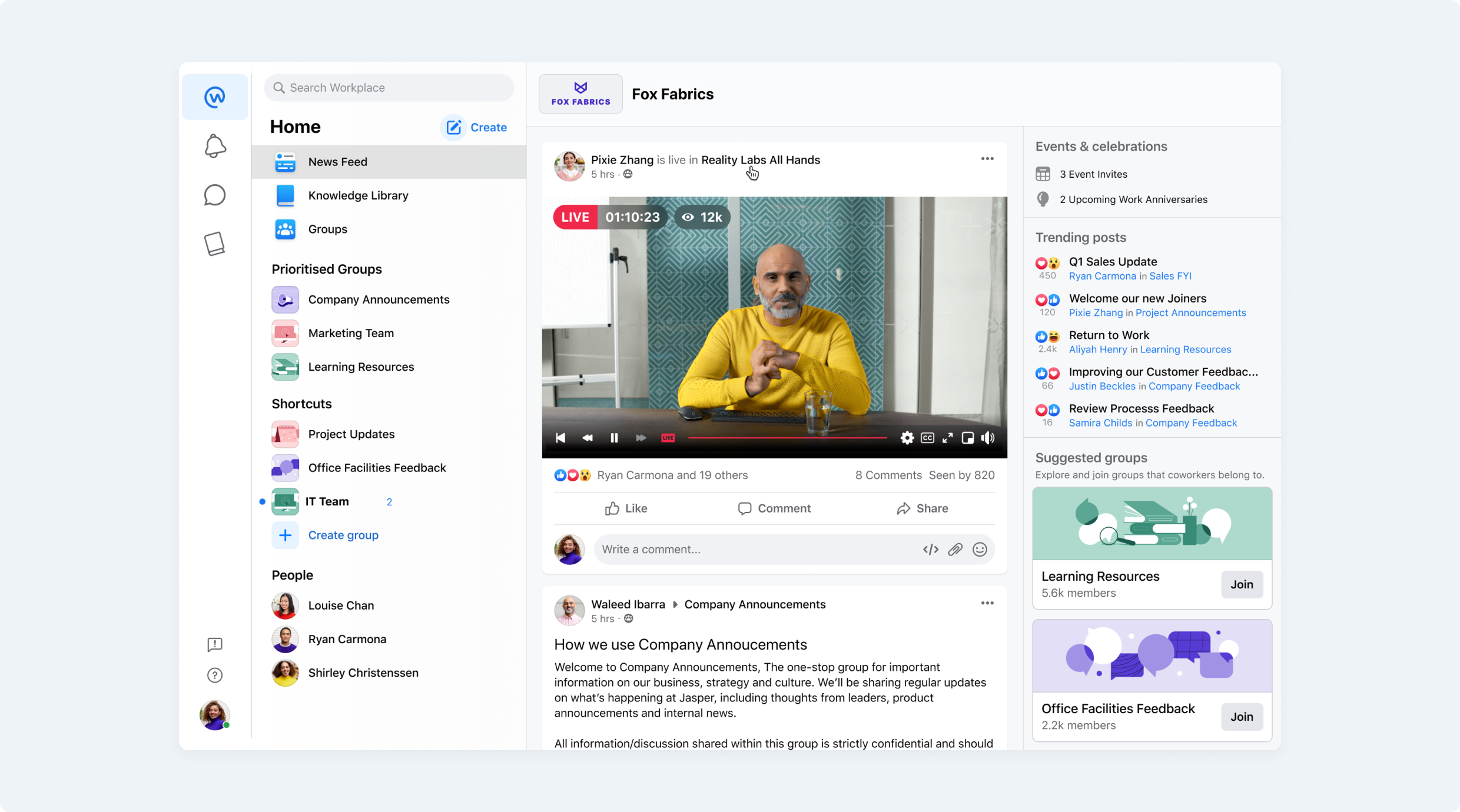 - Provide viewers with an easy consumption experience where they don't have to look around Workplace across the feed and various groups. Instead they can go to singular surface and find the latest organisational broadcast from leadership.