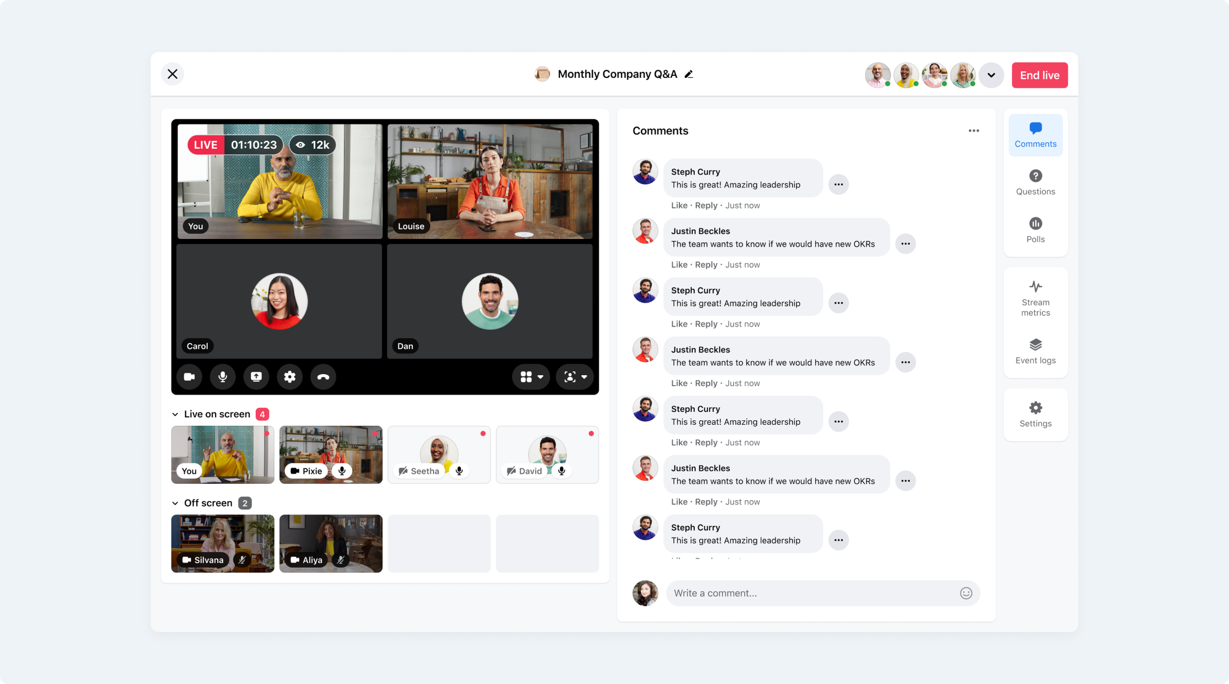 - Provide presenters with a singular studio like surface where they can go live, do multi-player broadcasts with other leaders, measure sentiment as the event goes on and also have various tools to engage with the audience.