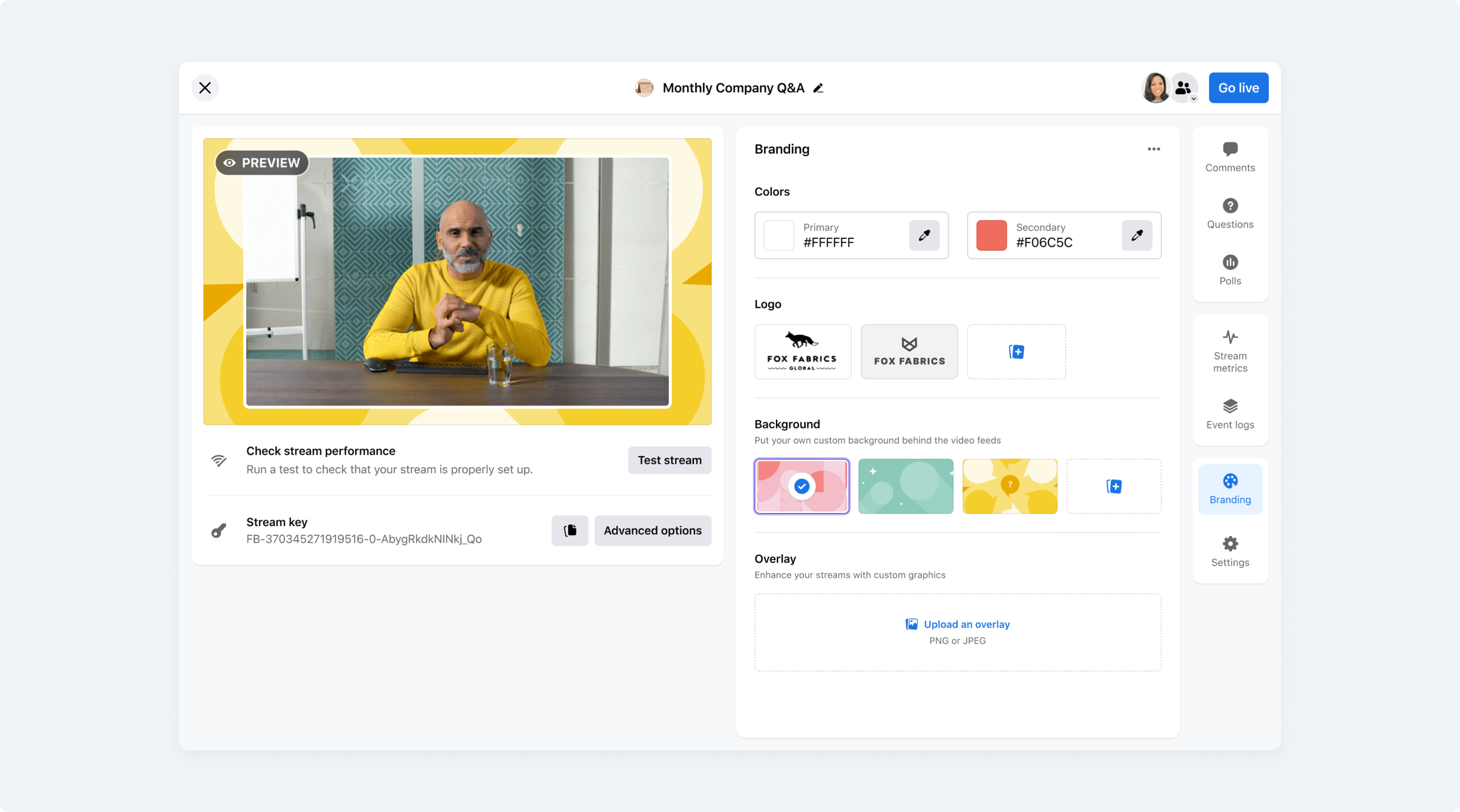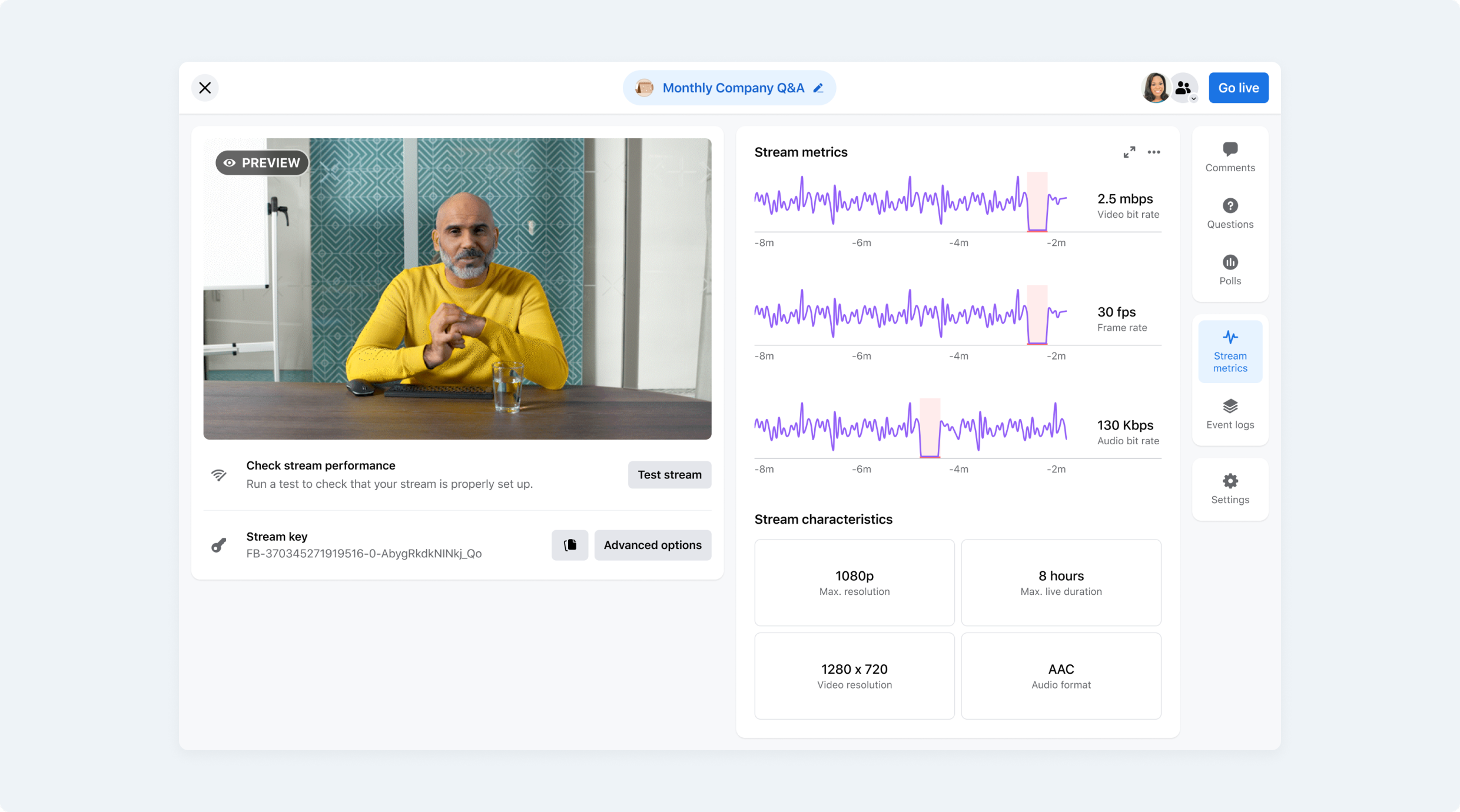 For technical producers, studio made it easy to plug in a video stream from complex camera equipment using advanced stream keys, additionally they could monitor quality throughout.